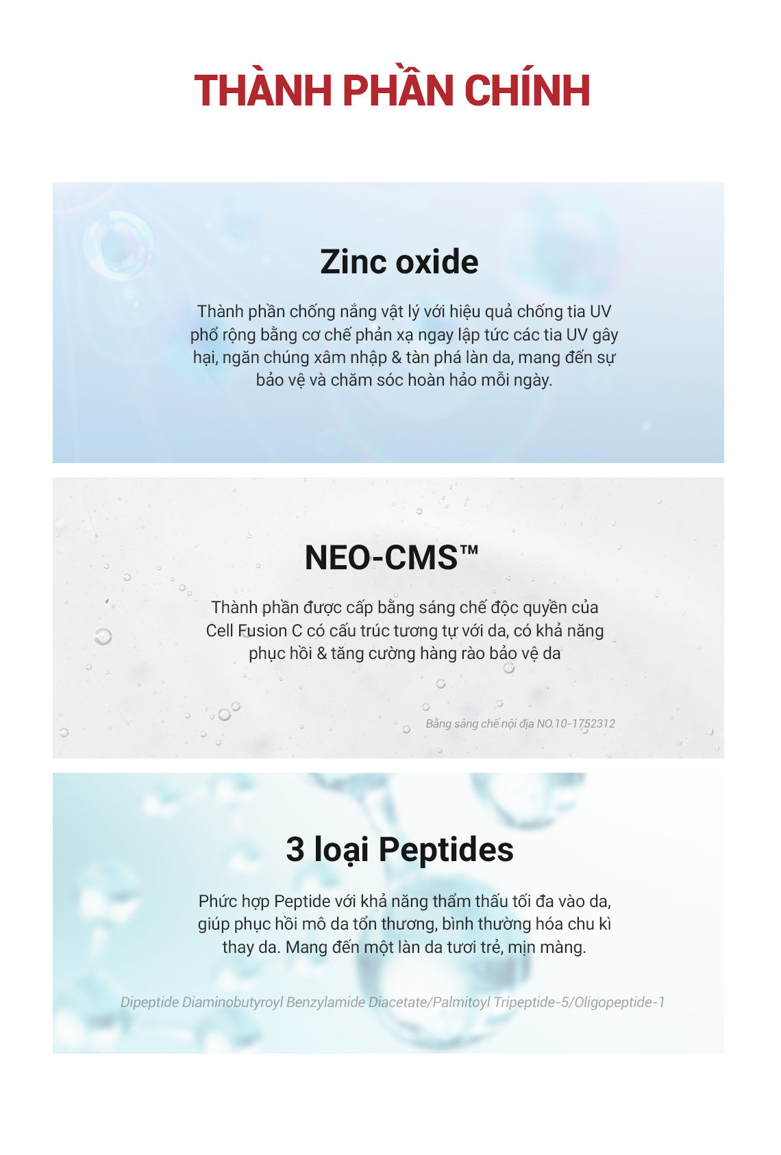 - EGF & Syn-akepeptide & Palmitoylpeptide: Phức hợp peptide hỗ trợ tái thiết lập hoạt động tự nhiên của da, tăng cường khả năng duy trì cấu trúc da, giúp da trông mịn màng và tươi sáng hơn.