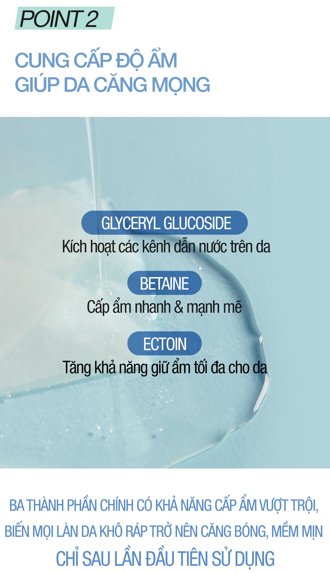 - Triple Moisturising (Betaine, Ectoin, Glyceryl Glucoside): Cấp ẩm vào trong các tế bào da ở dưới biểu bì, giữ cho da luôn ngậm nước và căng mướt.
